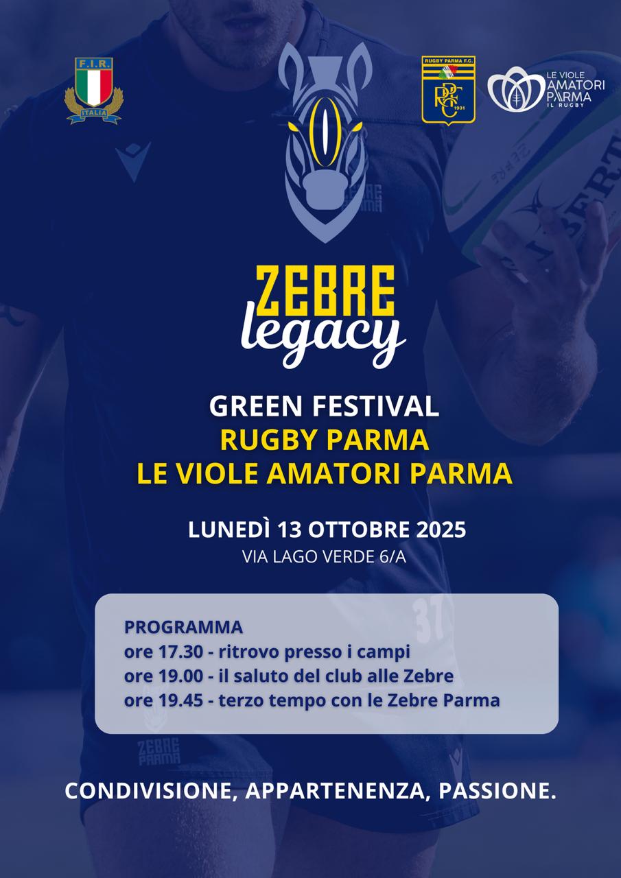 Lunedì 13 ottobre 2025 il campo Banchini di via Lago Verde si trasformerà nel cuore pulsante del rugby con il Green Festival “Zebre Legacy”: una giornata di sport, passione e condivisione insieme ai campioni delle Zebre Parma, alla Rugby Parma e a Le Viole Amatori Parma.