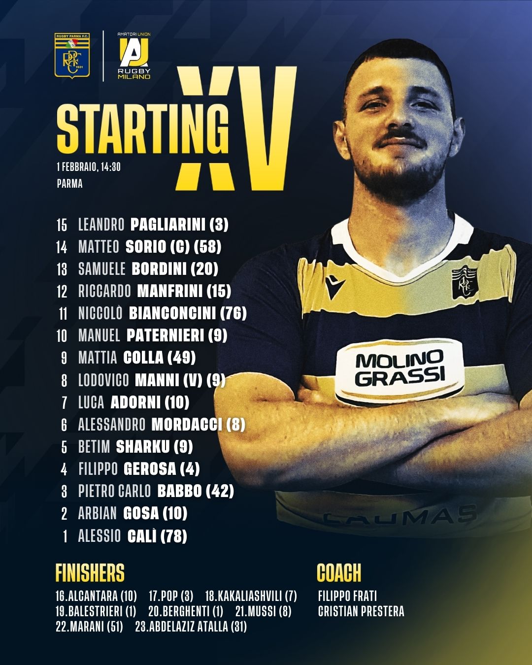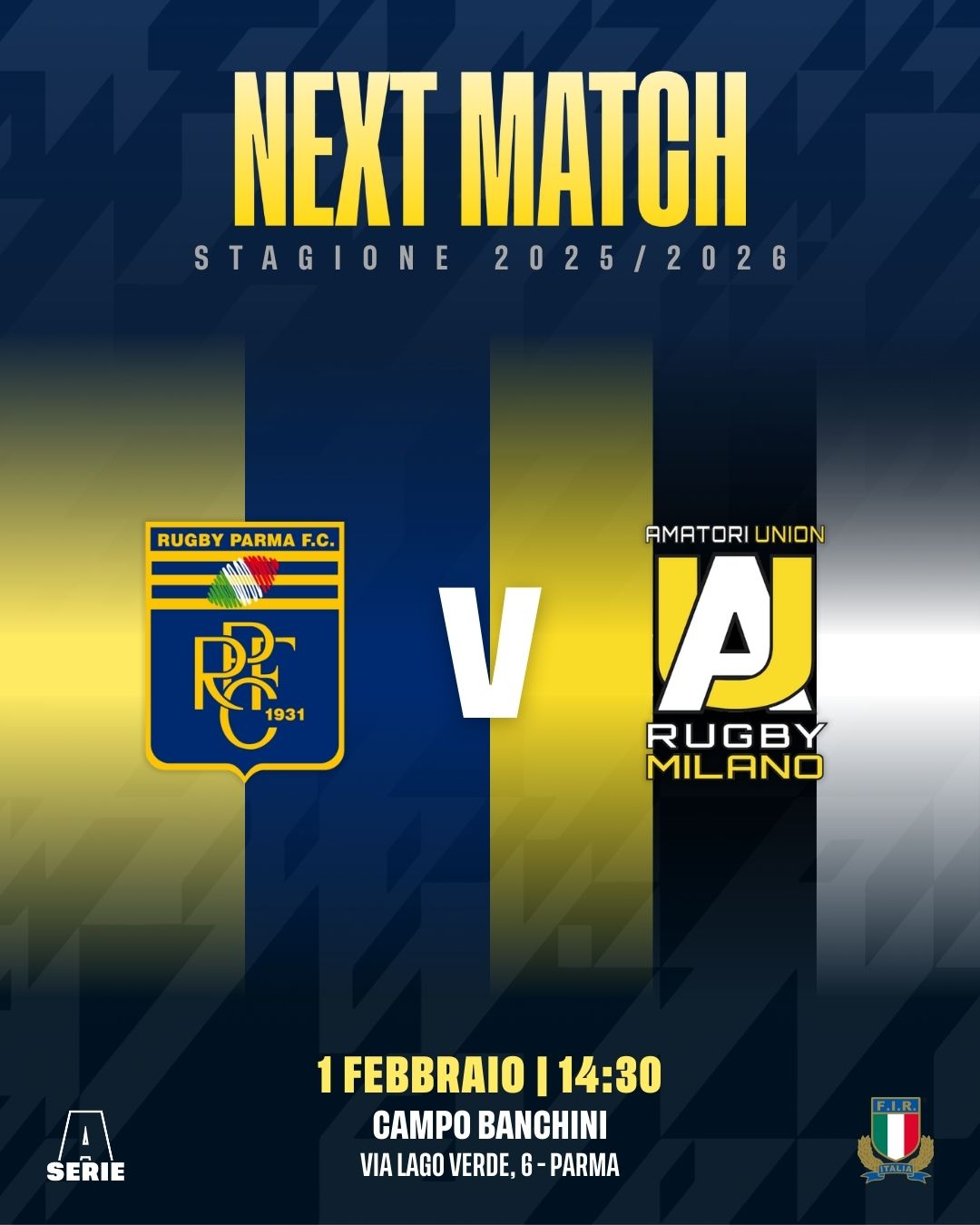 In occasione della 1ª giornata di ritorno del Campionato di Serie A – Girone 2, la RUGBY PARMA scenderà in campo domenica al Banchini contro l’AMATORI & UNION RUGBY MILANO con questa formazione: