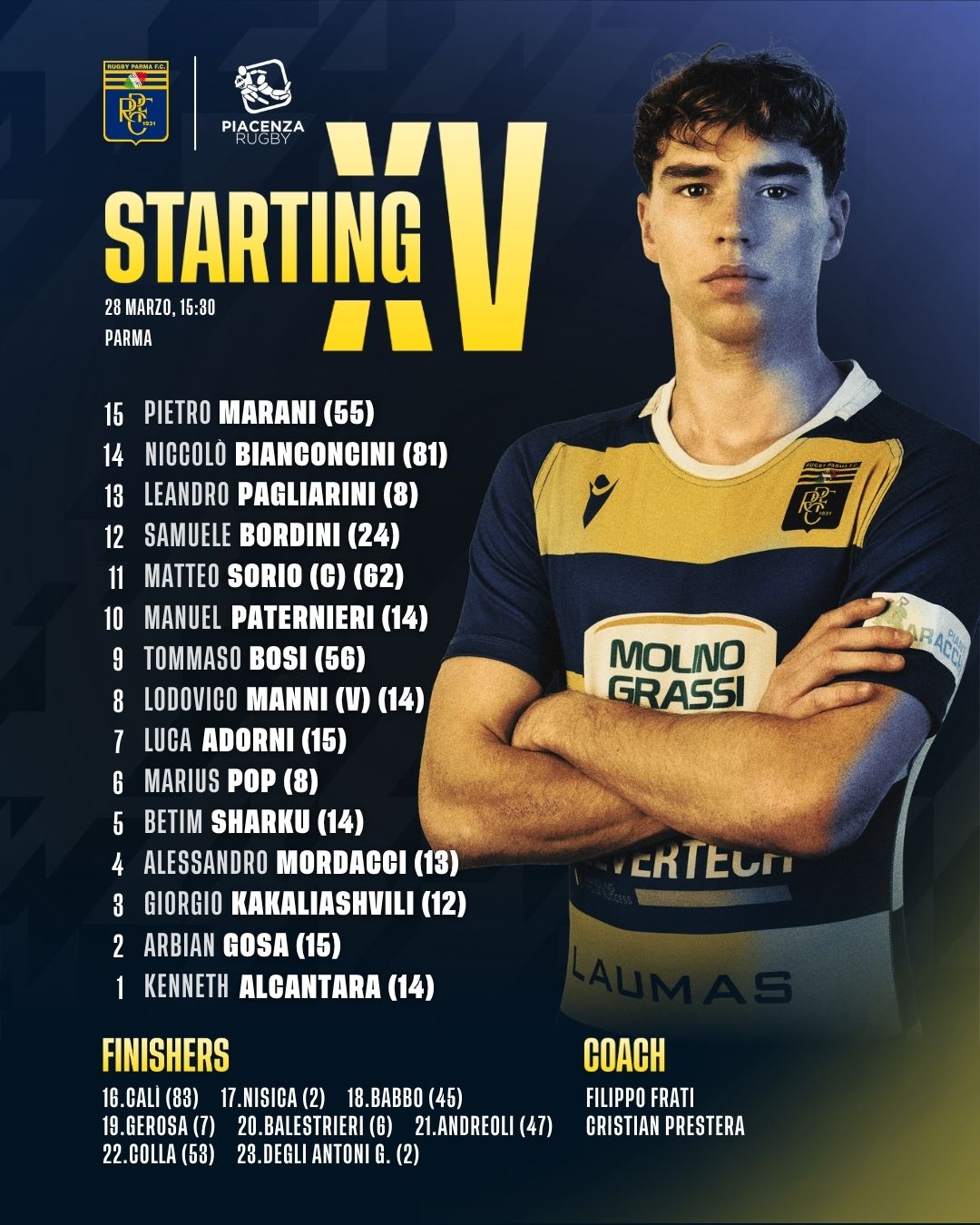 In occasione della 7ª giornata di ritorno del Campionato di Serie A – Girone 2, la RUGBY PARMA scenderà in campo domenica al Banchini contro il PIACENZA RUGBY CLUB con questa formazione: