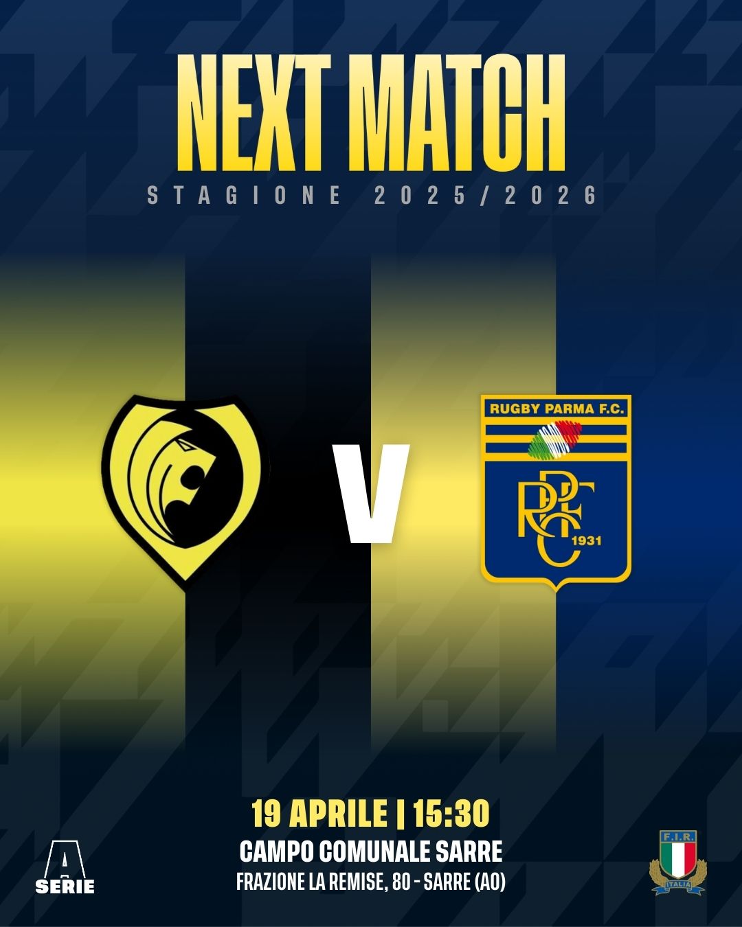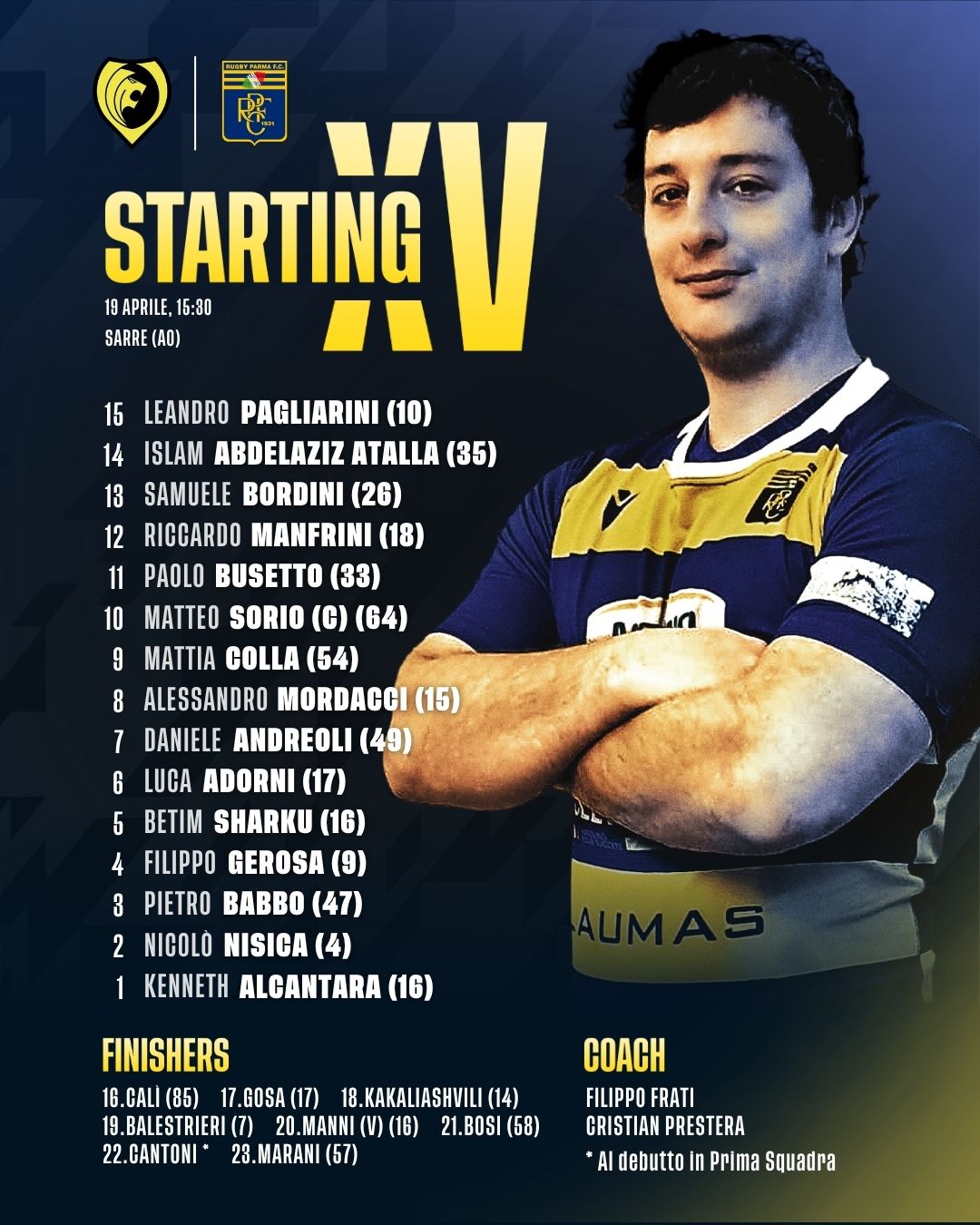 In occasione della 9ª giornata di ritorno del Campionato di Serie A – Girone 2, l’ultima della regular season, la RUGBY PARMA scenderà in campo domenica allo Stadio Comunale di Sarre (AO) contro lo STADE VALDÔTAIN RUGBY con questa formazione: