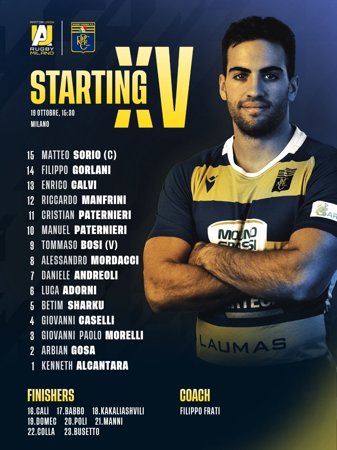 In occasione della 1ª giornata del Campionato di Serie A Girone 2, la RUGBY PARMA scenderà in campo domenica al Crespi di Milano contro l’AMATORI UNION RUGBY MILANO con questa formazione: