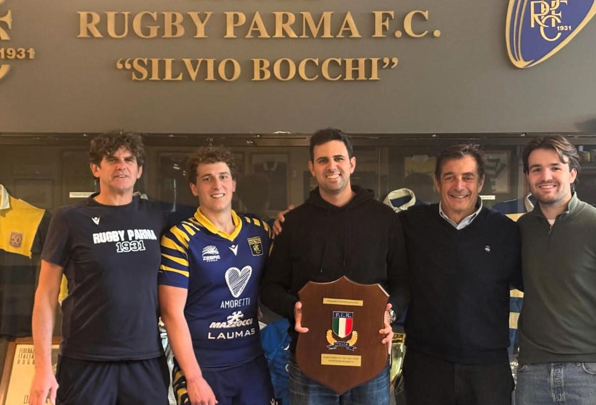 Oltre al presidente Borri e al coach Trasatti, alla consegna del trofeo erano presenti anche il vice presidente della Rugby Parma, Pietro Rusconi, Jacopo Guatelli e Francesco Conti, rispettivamente capitano e vice capitano della squadra Cadetta nella passata stagione.